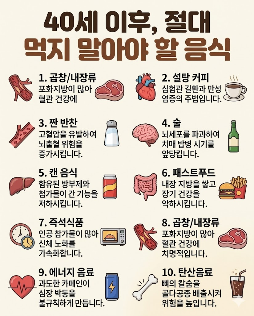 나이가 들면서 몸이 예전 같지 않다는 걸 부쩍 느끼게 되는데요. 특히 마흔이 넘어가면 40대 식단 관리가 선택이 아닌 필수가 됩니다. 젊을 때 즐겨 먹던 야식이나 자극적인 음식들이 이제는 몸에 독이 될 수 있습니다. 건강을 지키기 위해 일상에서 피해야 할 음식들을 바로 확인해 보겠습니다.